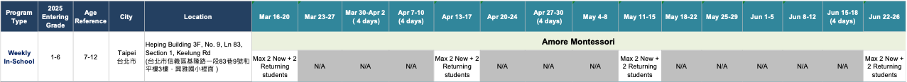 For 2025-2026, new visiting students in Grades 1-6 will be able to join the in-school program for 1 week only, returning students can join for 1-4 weeks and for weeks not listed on the schedule. Please refer to the schedule for the weeks available for registration or inquire within for weeks not posted.