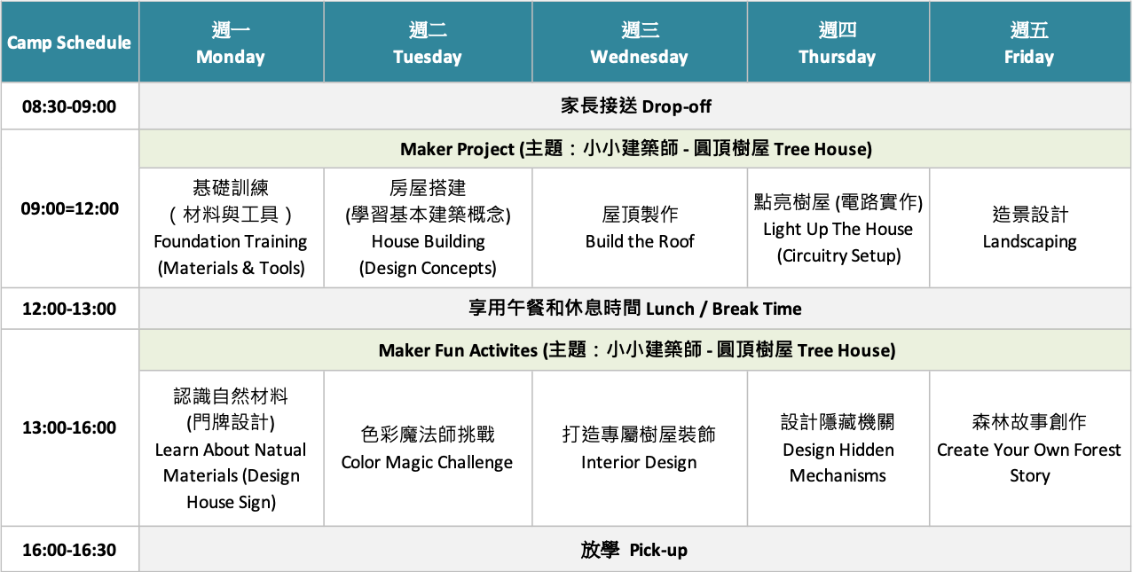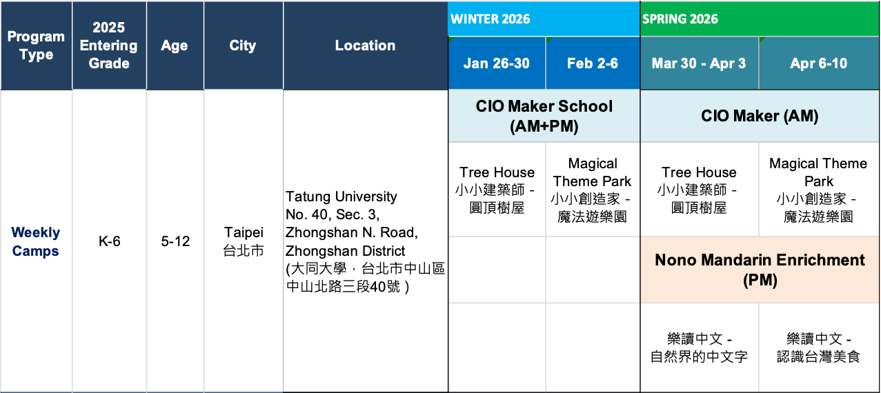CIO Maker School is a local camp and after-school program provider in the Greater Taipei area. Each camp session is organized in a small group format, with a teacher-to-student ratio of 1:4.