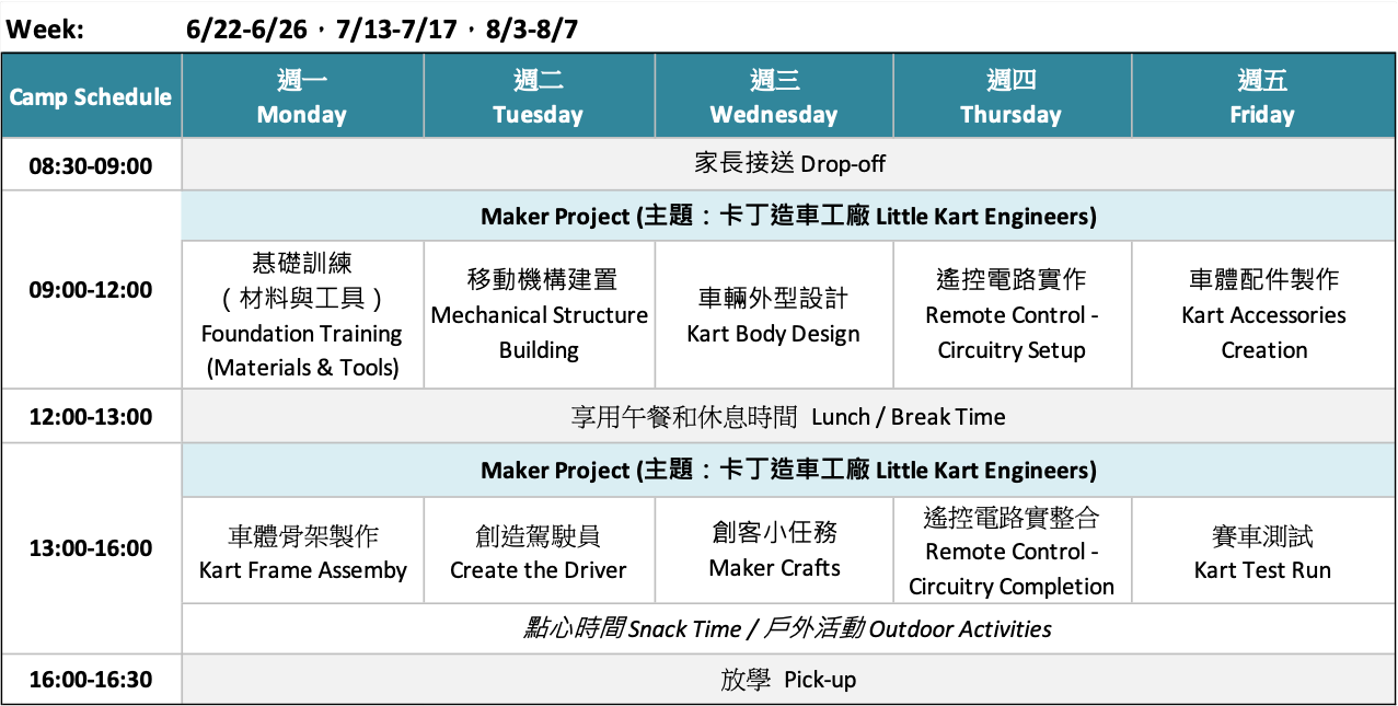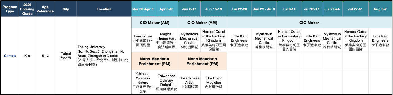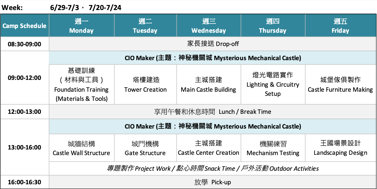CIO Maker School is a local camp and after-school program provider in the Greater Taipei area. Each camp session is organized in a small group format, with a teacher-to-student ratio of 1:4.