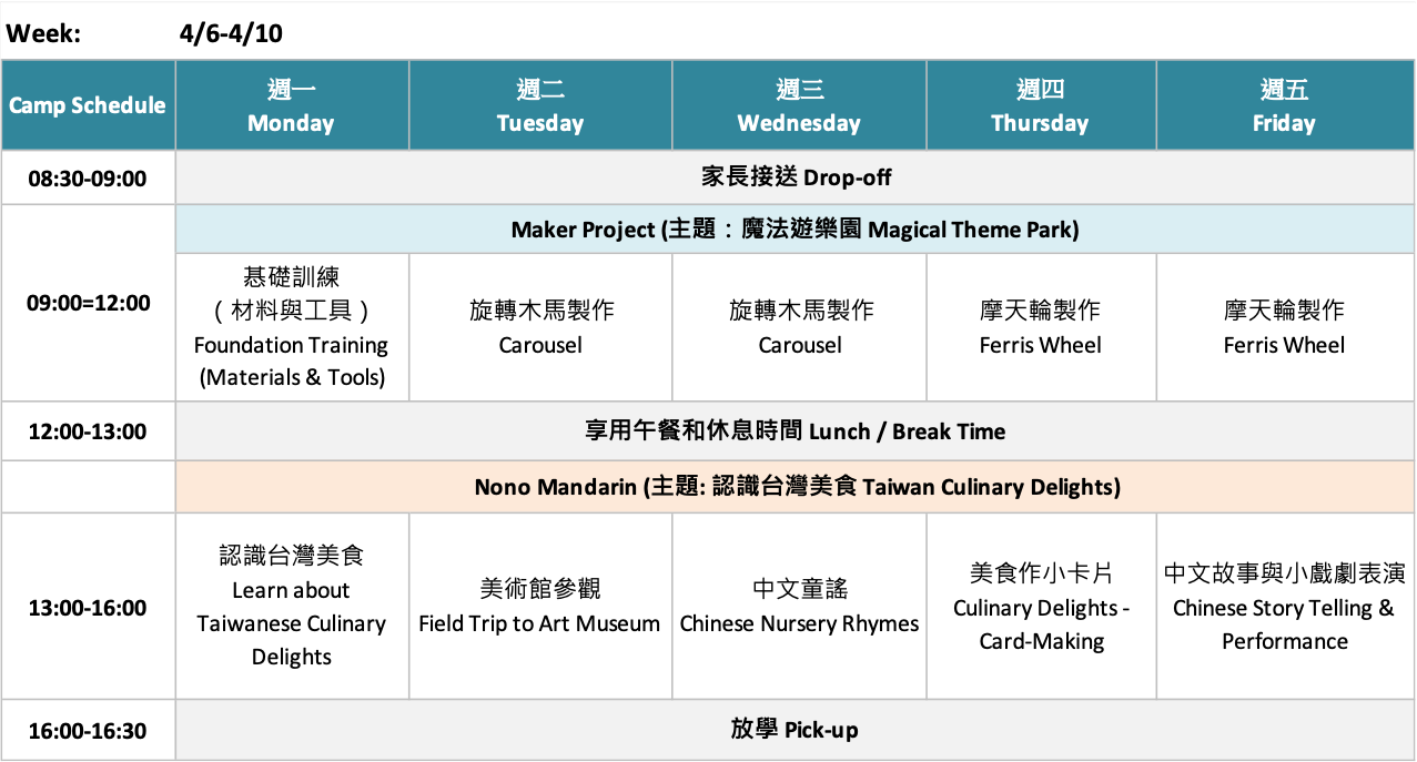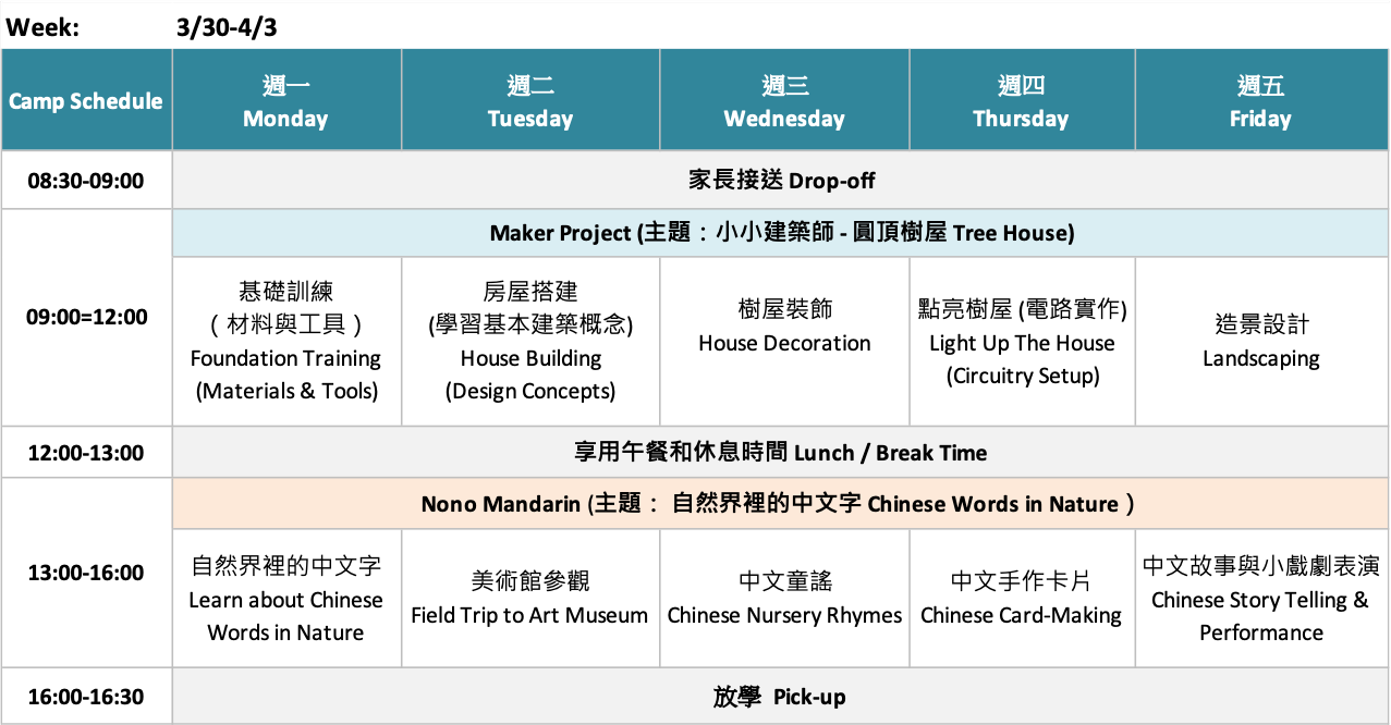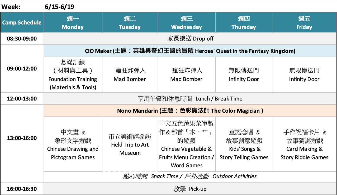 Download PDF version of schedule / content described below for CIO Maker (+Nono Mandarin) Spring / Summer Camps